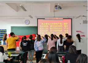随后,宣誓仪式在庄严雄伟的《国际歌》中拉开了帷幕,宝石党支部书记李继红老师带领全体党员起立奏唱《国际歌》,铿锵的歌声不仅响彻教室,更把歌曲的深刻意义渗进了每一位党员的心里,望大家把先辈崇高的共产主义理想和英勇不屈的革命气概铭记于心。激昂的歌声过后,宝石党支部书记李继红老师随即带领预备党员进行入党宣誓。这神圣的时刻,不仅仅是让预备党员铭记在心,回味一生,也让在座的每一名党员作为经历者和见证者都记忆深刻,久久回味。这是一堂生动鲜活的党课,对增强学院党员党性意识和觉悟具有积极的教育意义。
