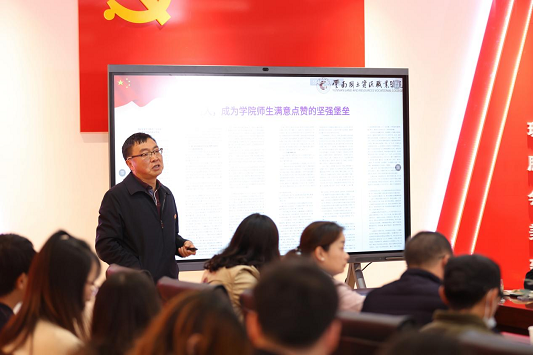 党课上,牛定柱书记从四个方面切入,一是以创促建,成为一流党建三级联创的排头标兵。牛定柱书记结合学校工作实际,以学校“1958”党建工作思路为契入点,从学校党委、党总支、党支部三个层面对党员做出了不同的要求。他强调要持续强化支部建设,建设党支部坚强战斗堡垒;二是党建引领,成为学院高质量发展的示范高地。他指出要全面夯实党建引领基础,党支部要发挥工作托底、任务落实和组织保证的作用,推动学校教育教学实践活动;三是铸魂育人,成为学校涵养师德师风的重要平台。党支部党员教师要时刻发挥先锋模范作用,以立德树人铸就教育之魂;四是立德树人,成为学院师生满意点赞的坚强堡垒。号召党员教师要始终以育人为本,狠抓师德师风建设,争做“四有”好老师。要求党员教师努力做到“六个坚持”,明白办好教育的根本保证就是加强党的教育工作的全面领导,要以建设教育强国为行动指南,找准教育系统的发力点,系统推进、重点发力,用六个“下功夫”来培养德智体美劳新时代接班人。他强调学校党支部是锻造人才、凝聚师生、攻坚克难的重要平台,只有充分发挥党支部的引领作用,用一流的党建引领一流的学科发展,才能推动学校在“十四五”期间实现高质量发展。
