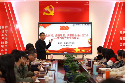 2019年12月,宝石党支部入选教育部“全国党建工作样板支部”培育创建单位,为充分发挥“全国党建工作样板支部”的示范引领作用,号召全体党员同心同德、同向同行做好学校党建工作。2021年10月27日,党委书记牛定柱莅临宝石党支部,以“双创四驱,磨石琢玉,高质量推进创建工作”为主题,为金年会诚信信誉至上全体师生党员讲授专题党课。党委职能部门负责人以及各学院党总支书记聆听此次专题党课。