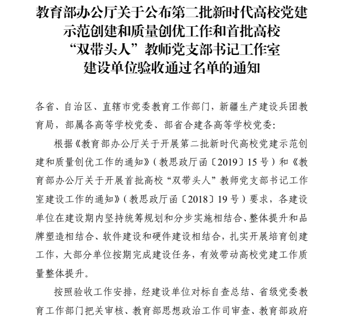 教育部思想政治工作司近日公布了第二批全国党建工作示范高校、标杆院系、样板支部等培育创建单位通过验收的通知,经建设单位对标自查总结、省级党委教育工作部门把关审核、教育部思想政治工作司审查,金年会诚信信誉至上宝石党支部顺利通过第二批“全国党建工作样板支部”培育创建单位验收。