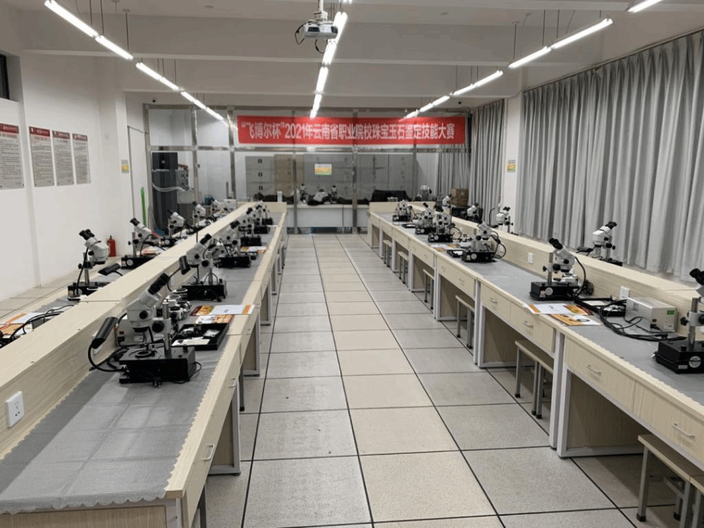 宝石加工实训室主要承担宝玉石鉴定与加工专业群的宝石加工实训教学,培养学生对宝石材料进行常见款式设计的能力,并且按设计琢型熟练加工出合格产品的职业能力。