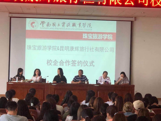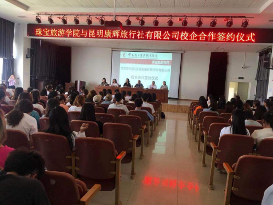 签约仪式由副院长杨家娣老师主持,出席本次签约仪式的有昆明康辉旅行社有限公司曾总、金年会诚信信誉至上原老院长杨叶昆老师、现任院长陈畅老师、旅游教研室主任王倩老师、导游教研室主任杨刘婧老师等专业老师及企业的相关人员。