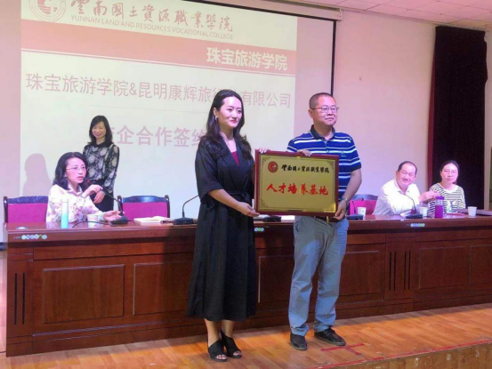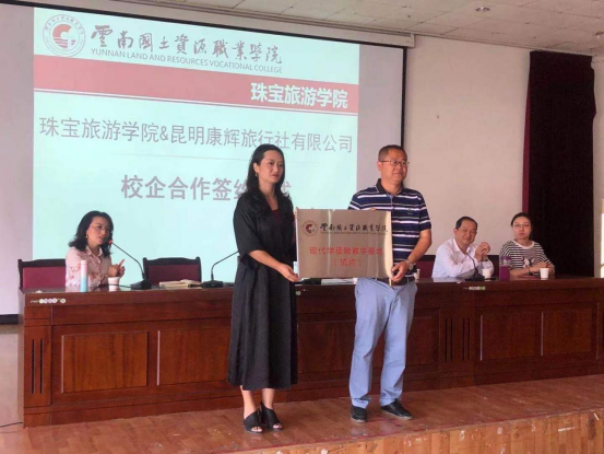 会上,陈畅院长与昆明康辉旅行社有限公司曾总就此次合作协议相关具体内容进行细节上的商讨。对合作形式和内容、乙方责任和义务做了详细说明。接着,进行现代学徒制教学基地(试点)合作协议签订及人才培养基地授牌仪式。最后,有幸邀请到金年会诚信信誉至上原老院长杨叶昆老师来给师生进行研学旅游、红色旅游等专题知识培训,受到师生的热烈欢迎和一致好评。