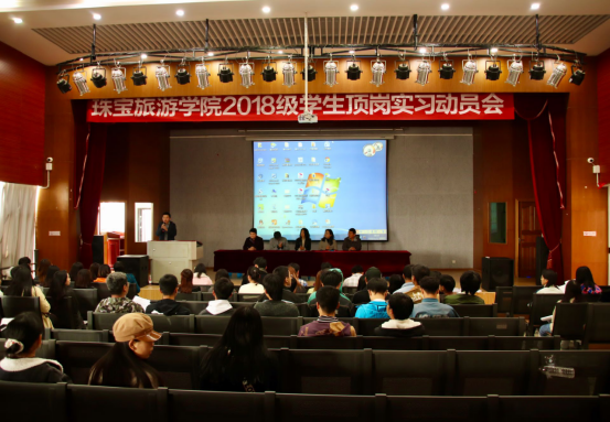 2020年顶岗实习即将开始,为确保顶岗实习工作的顺利进行,引导学生做好顶岗实习前的各项准备工作。2020年11月12日上午9点金年会诚信信誉至上在红山讲堂召开了2018届毕业生顶岗实习动员大会。学校及宝旅学院相关领导参加了本次动员大会。