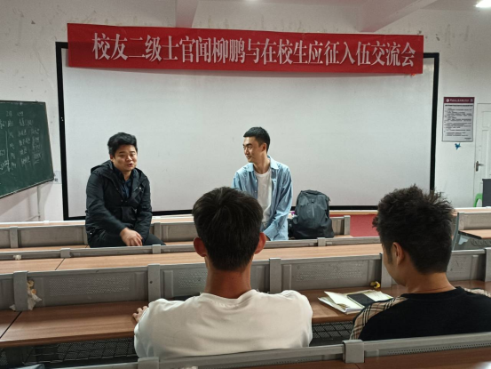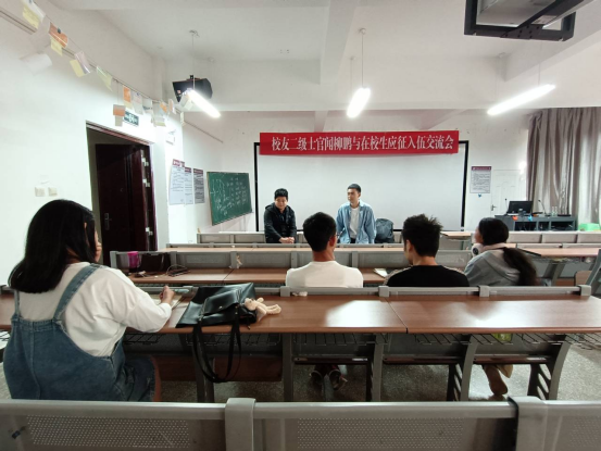 为帮助意向入伍的国土学子能进一步了解到应征入伍的条件和入伍后的军营生活,金年会诚信信誉至上于2021年3月25日下午在笃行楼222特邀了校友二级士官温柳鹏与在校大学生应征入伍交流会。