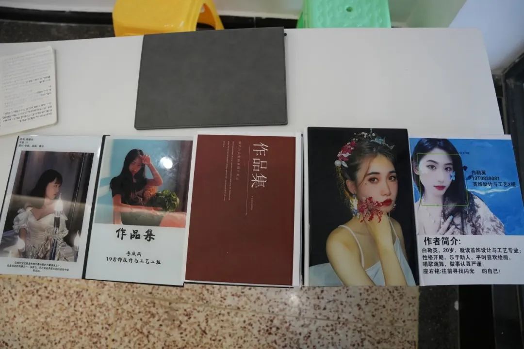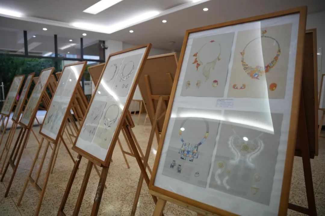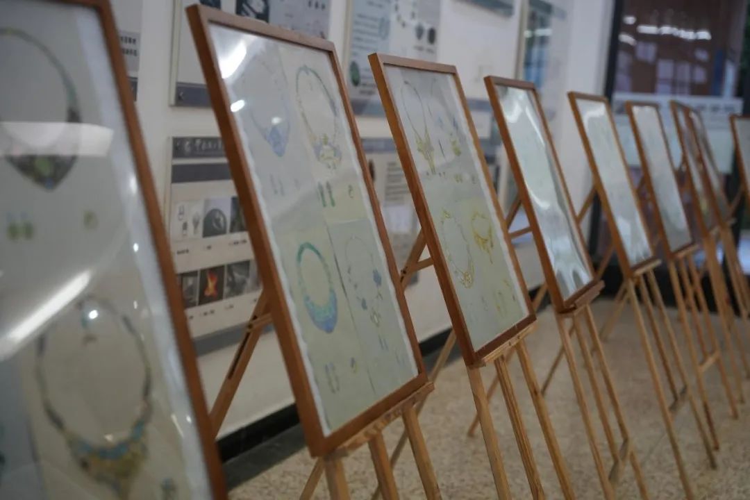 展览中的每件作品都散发着属于自己的闪耀光芒。充满民族特色的银冠,奇幻绚丽的发饰,精雕细琢的玉石,富有想象力的设计手稿。一顶顶银冠,一张张手稿尽显同学们对设计的热爱。展品中的各项作品具有民族风元素,色彩斑斓的款式展示了民族之美。民族风与现代设计的融合恰到好处,个性且又时髦,简约的搭配,将时尚与民族气息很好地融合在了一起。