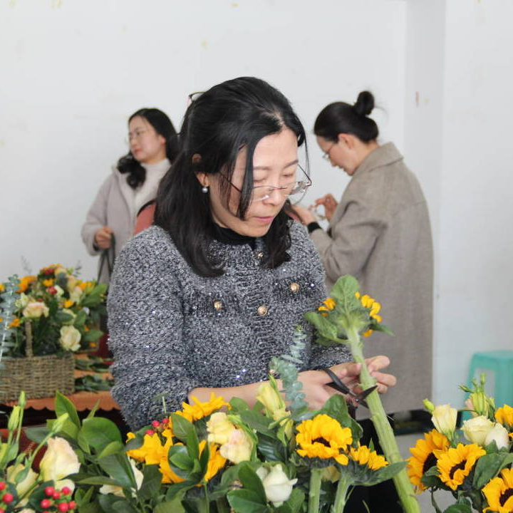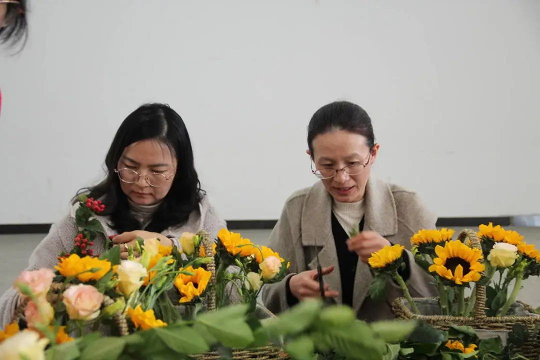 在花艺师的指导下,老师们兴致盎然地构思造型、挑选材料,用灵巧的双手将各色花卉配以枝叶点缀。