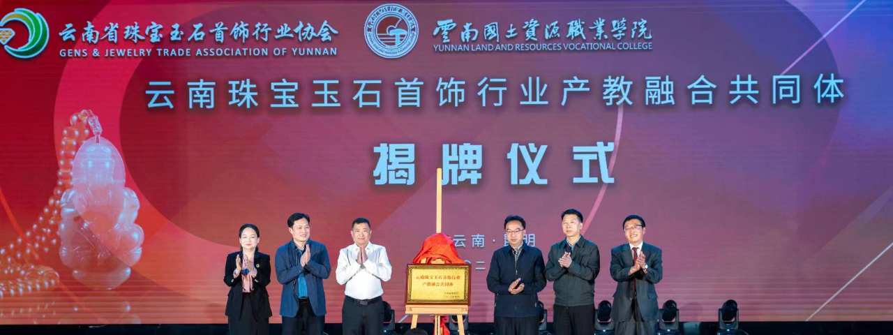 云南省教育厅职业教育与成人教育处处长龚利春、副处长胡正刚、云南省珠宝玉石首饰行业协会会长欧战洪、中国地质大学(武汉)珠宝学院党委书记薛保山、金年会jinnianhuicom党委书记牛定柱、校长陈颖为云南珠宝玉石首饰行业产教融合共同体揭牌。