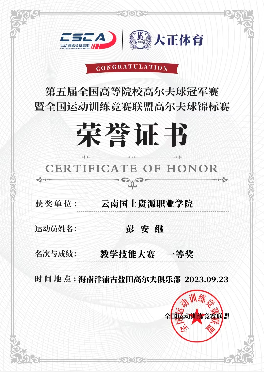 为进一步提升高等院校师资培育水平和人才培养质量。近日,由国家体育总局科教司倡导,全国运动训练竞赛联盟举办的第五届全国高等院校高尔夫球冠军赛在海南省儋州市打响。金年会诚信信誉至上彭安继老师代表学校参加了比赛。
