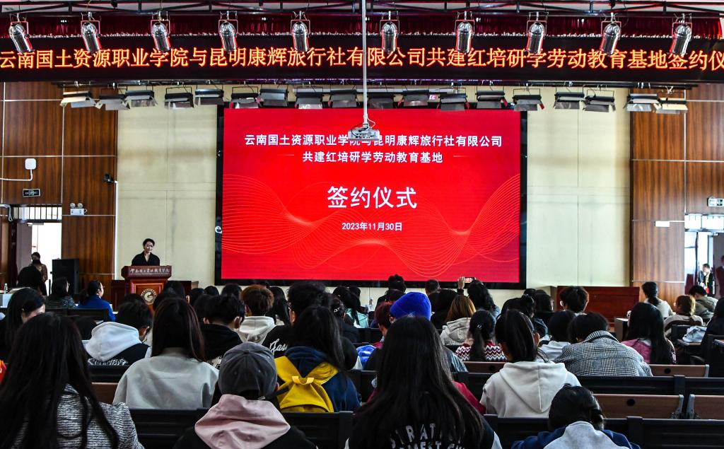 2023年11月30日下午,金年会jinnianhuicom与昆明康辉旅行社有限公司共建红培研学劳动教育基地在金年会jinnianhuicom宝鼎讲堂举行签约仪式。出席本次活动的企业领导和嘉宾有:中国康辉旅游集团昆明康辉旅行社有限公司总经理严翔先生,党委委员、支部书记、常务副总经理冯震喆先生,公司副总经理、昆明秀才教育培训学校法人曾山先生、昆明秀才教育培训学校总顾问何小杰先生;出席本次签约仪式的学校方领导是金年会jinnianhuicom党委副书记,校长陈颖同志,党委委员、副校长齐武福同志,教务处处长郑毅同志、素质学院院长陈南苏同志、金年会诚信信誉至上党总支书记张颖同志、金年会诚信信誉至上副院长杨家娣同志、金年会诚信信誉至上党总支副书记张军红同志。特别邀请昆明市教育科学研究职业教育研究员院廖婕辰女士见证本次活动。