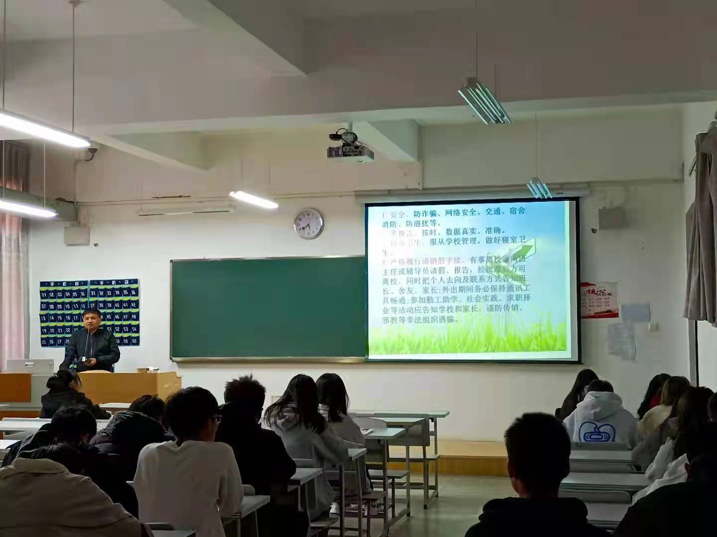 会议开始,杨勇老师首先要求学生们一定要提高安全意识,安全无小事。并且为同学们介绍了近期高校发生的安全问题事件,明确指出了学校安全教育工作的紧迫性。然后就大学生生活中要注意预防诈骗、网络安全、交通安全、宿舍安全、消防安全、防滋扰安全等进行了培训。其次从零报告、宿舍卫生、严格履行请销假手续等三个方面进行了讲解和指导。最后,杨勇老师提醒同学们一定要提高预防网络诈骗的意识,增强自我防范能力,保护好自己的人身财产安全。