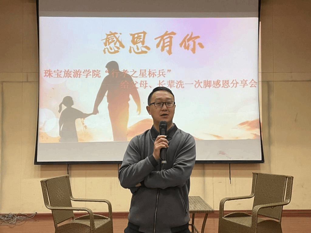 分享会现场中,学生在5分钟的时间内通过PPT展示与现场解说,图文并茂地分享了自己为父母洗脚时的感受。其中,有的同学分享了父亲粗糙的脚像一把利剑一样刺在自己心中,又讲起老去的父母所承受着的辛酸而声泪俱下。同学们在分享中都表达出了那份对父母的感激与愧疚之情。