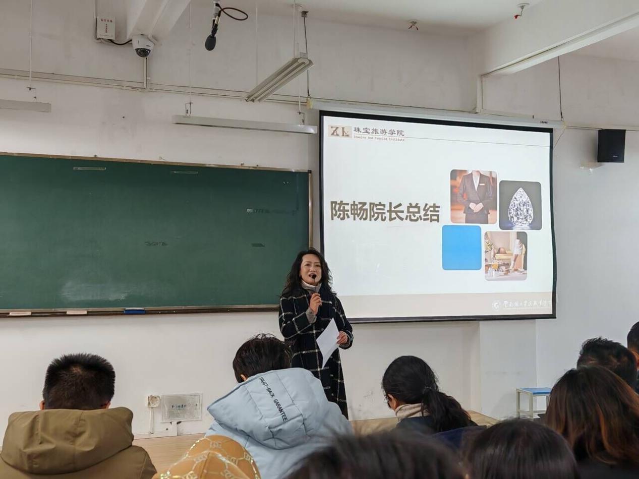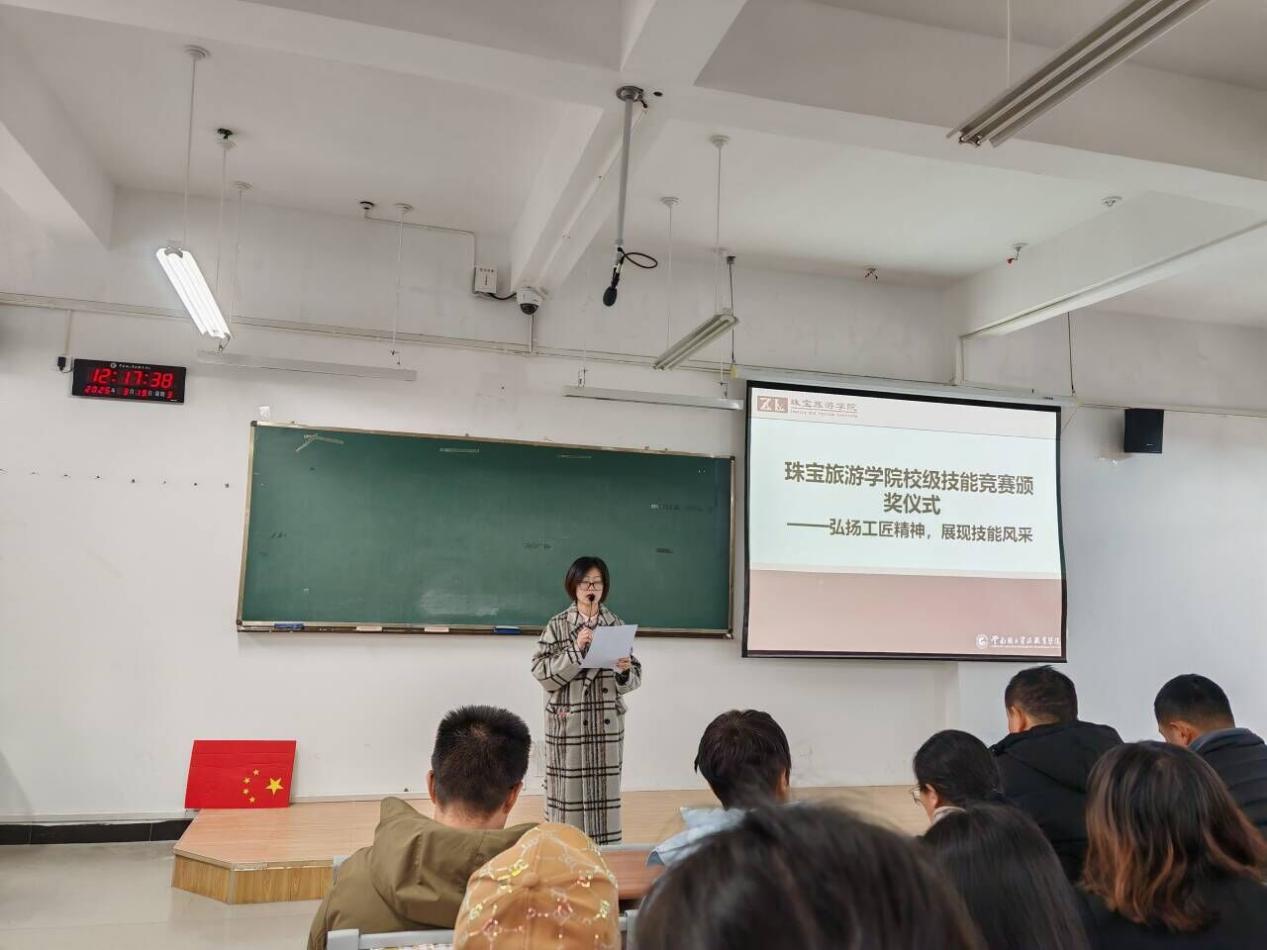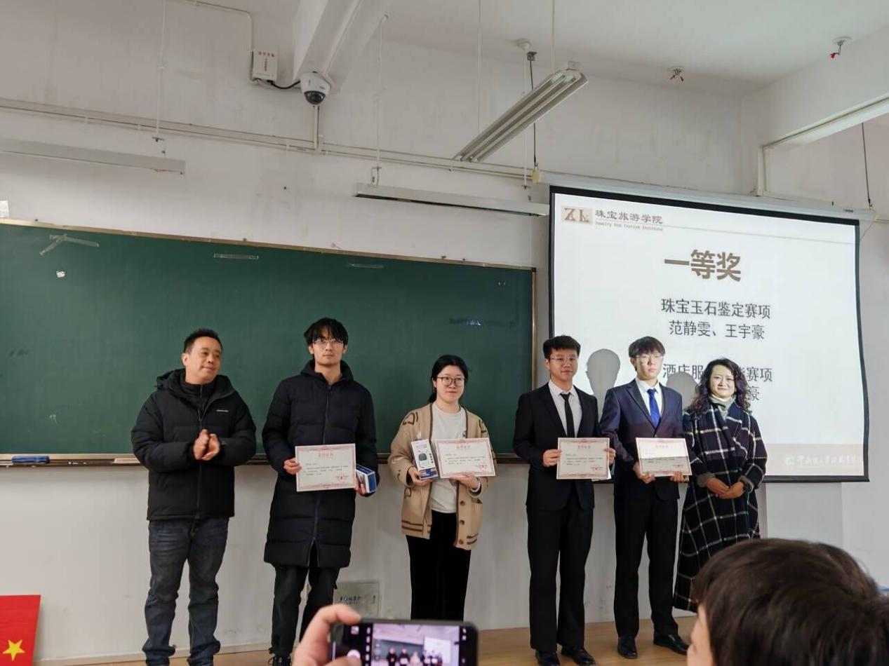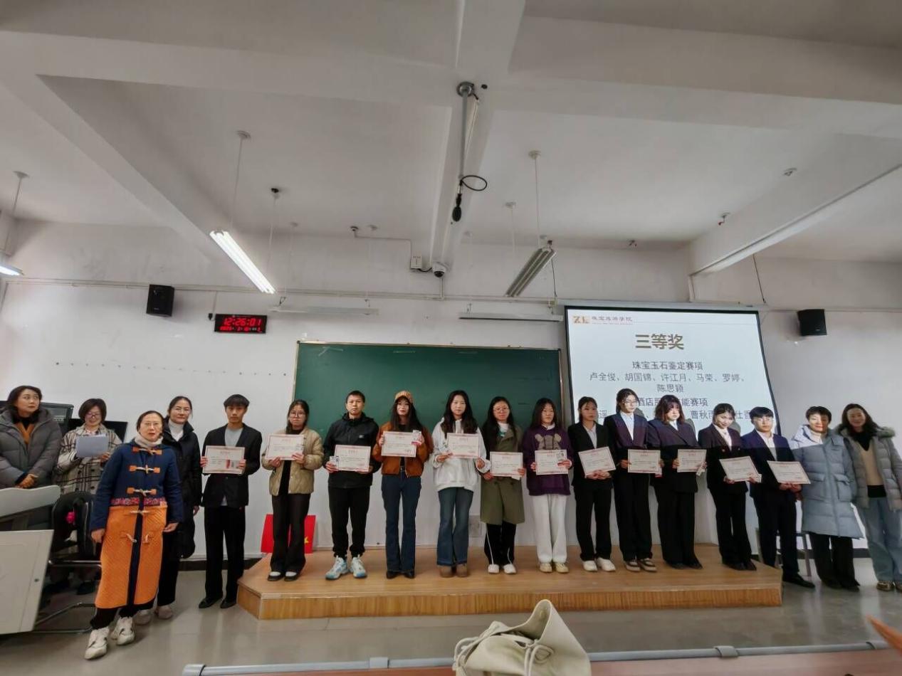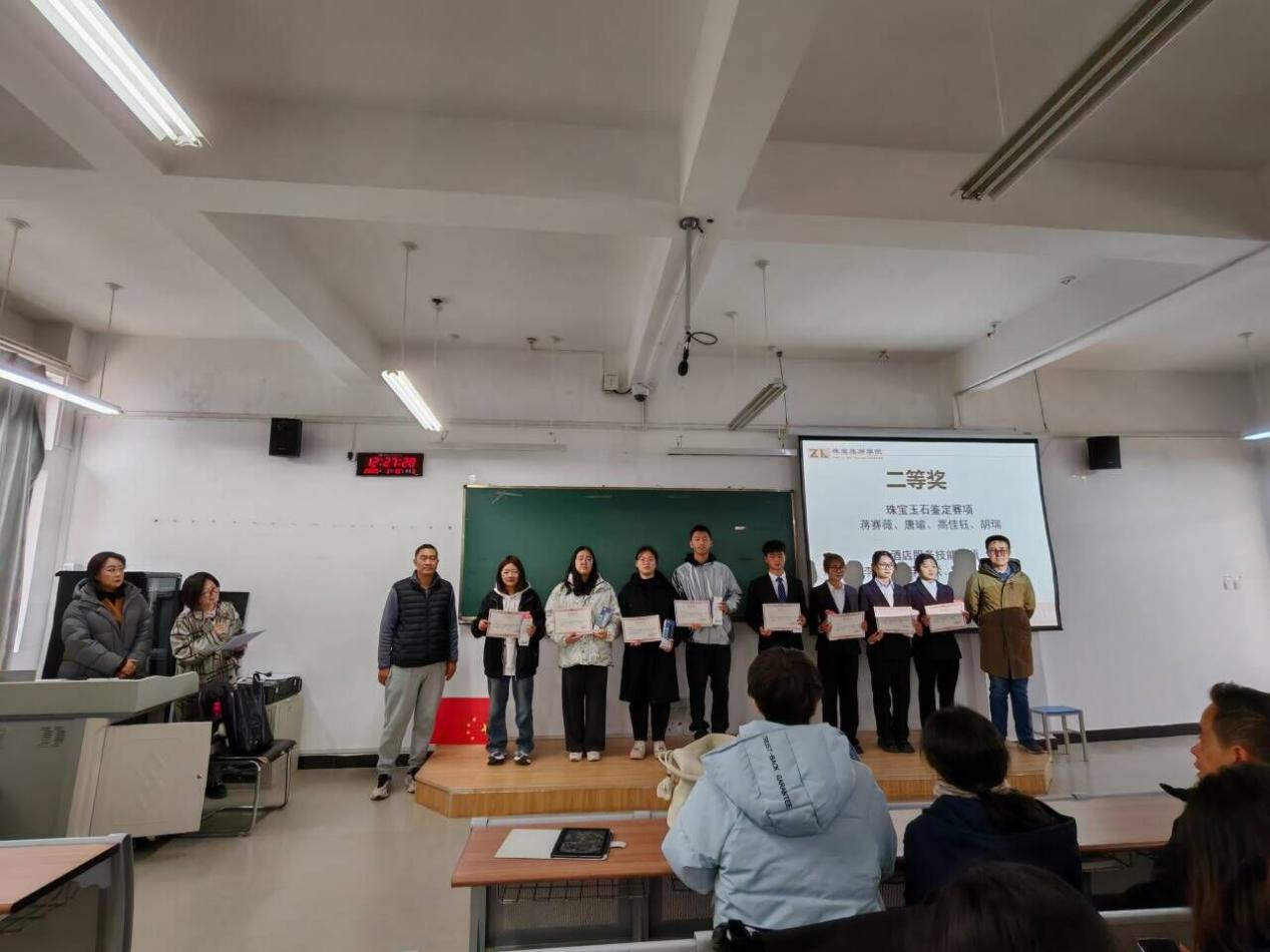 仪式开始首先由陈畅院长发言,她对本次比赛选手表示祝贺以及对指导老师表示了感谢。本次竞赛酒店服务赛项与宝玉石鉴定赛项的88名同学积极参与,每位同学都展现出了自己的专业技能。师生同心,铸造了可观的成果,从理论学习到实践比赛,同学们以身作则,指导老师通过人才培养的升级,发现教学中存在的短板。学院党委书记袁佳和院长陈畅为获奖同学颁奖。