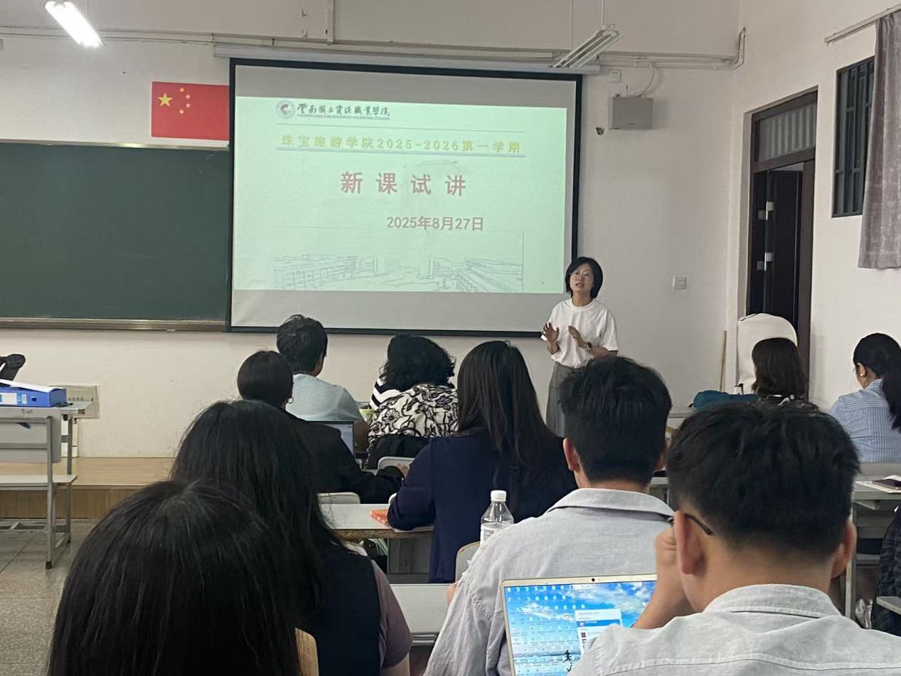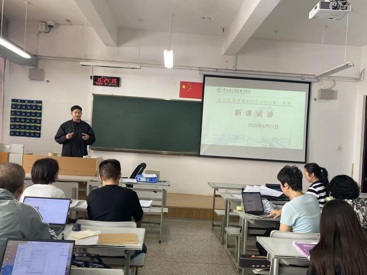 为夯实教学基础,确保新学期课程教学质量,助力教师精准把握教学方向,近日,金年会在笃行楼204组织开展新学期教师新课试讲活动。学院副院长陈雨帆、孟龑,宝石教研室主任杨莉、旅游管理教研室主任王颖、休闲服务与管理教研室主任马云燕组成评审团,对29位授课教师的试讲内容进行专业点评与指导。