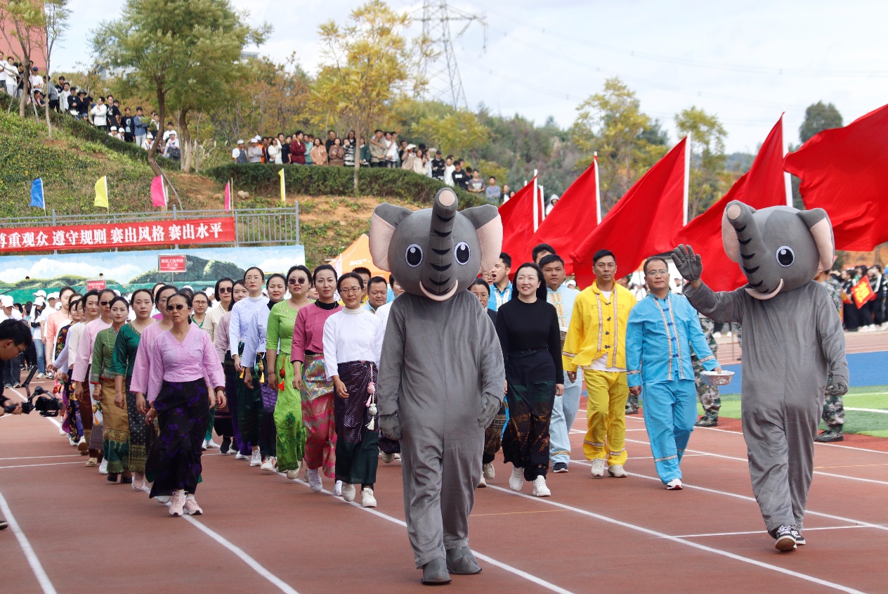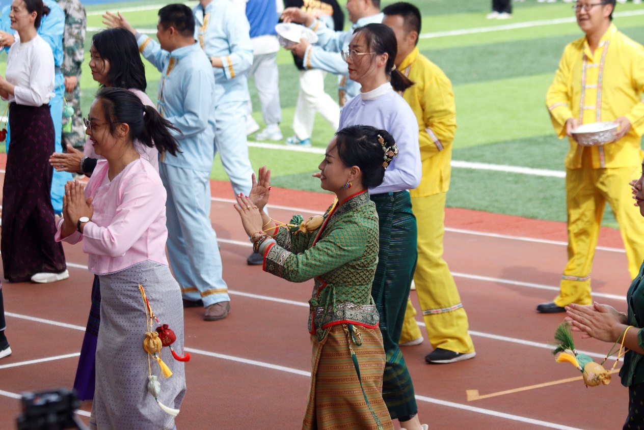 随后,教师方阵登场,他们身着民族服饰,在两只吉祥物的陪伴下,向我们展示了坚定和稳健的步伐。他们是宝旅学子的运动健儿的模范,他们的出现,昭示着我们的信心和决心。