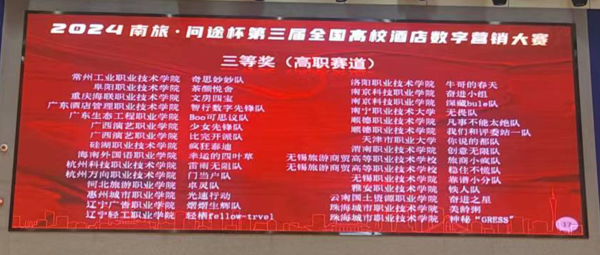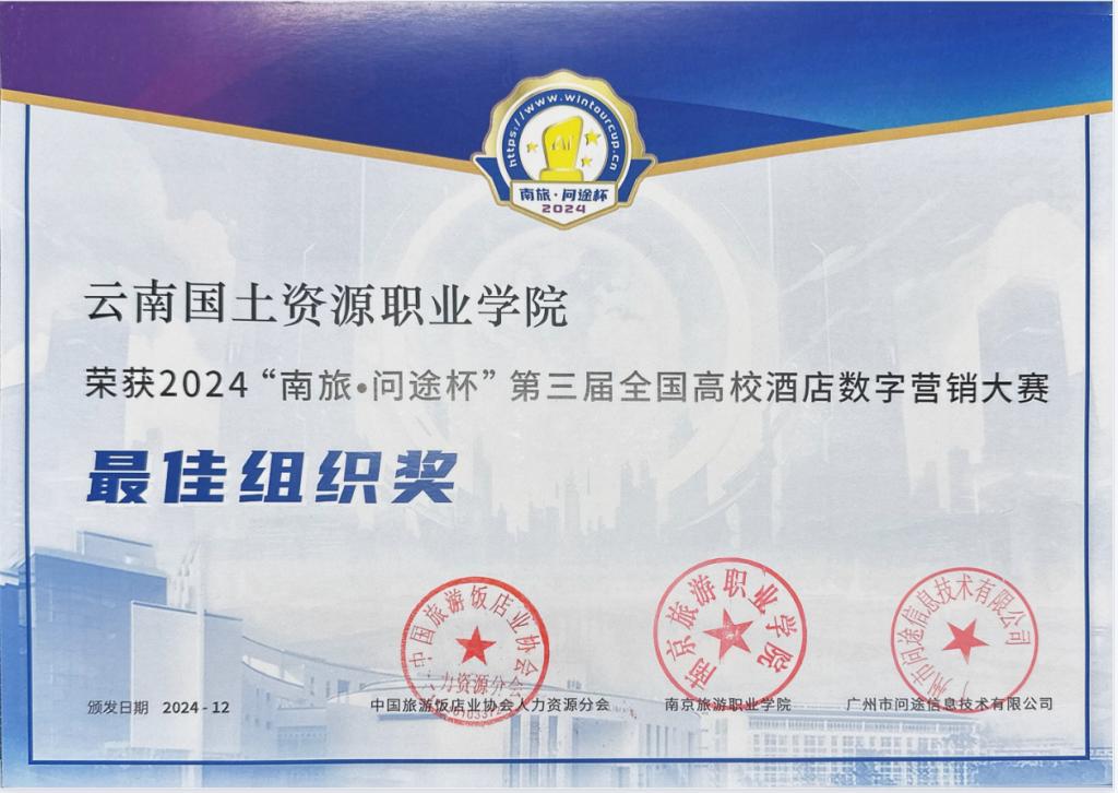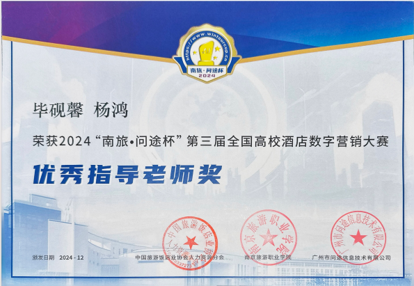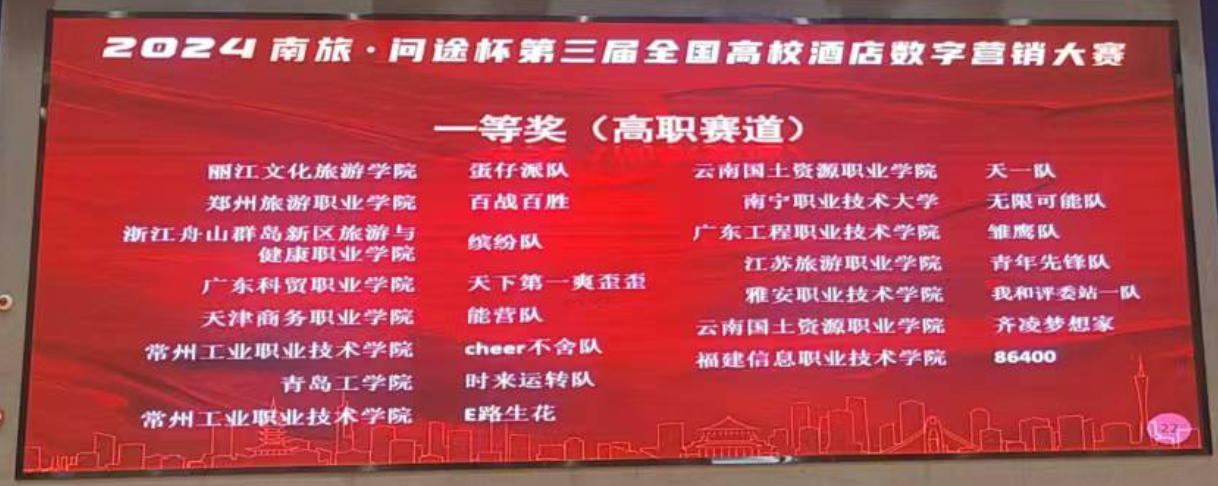 2024年12月7日,备受瞩目的“南旅·问途杯”第三届全国高校酒店数字营销大赛圆满落下帷幕。比赛紧密围绕产业数字化转型需求和酒店数字营销工作场景设计竞赛内容和任务,融入了最新的数字化技术和人工智能多模态AIGC技术。经过激烈角逐,来自金年会jinnianhuicom酒店管理与数字化运营专业的三支参赛队伍脱颖而出,获得了令人瞩目的成绩。其中,天一队(队员:代雪芬、赵燕青、苏云丽、张贵华)和齐凌梦想家队(队员:蒲璇宇、左顺玉、李天玲、陆蓉)凭借出色的团队协作与创新思维,成功摘得全国一等奖的桂冠;奋进之星队(队员:黄丽、刁冬梅、石火喷、李思懿)也不负众望,荣获全国三等奖。